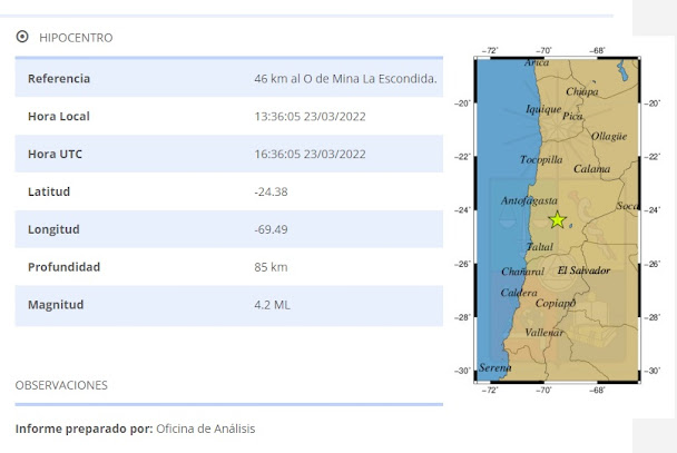Sismo en región de Antofagasta, miércoles 23 de marzo, 13:36 pm
